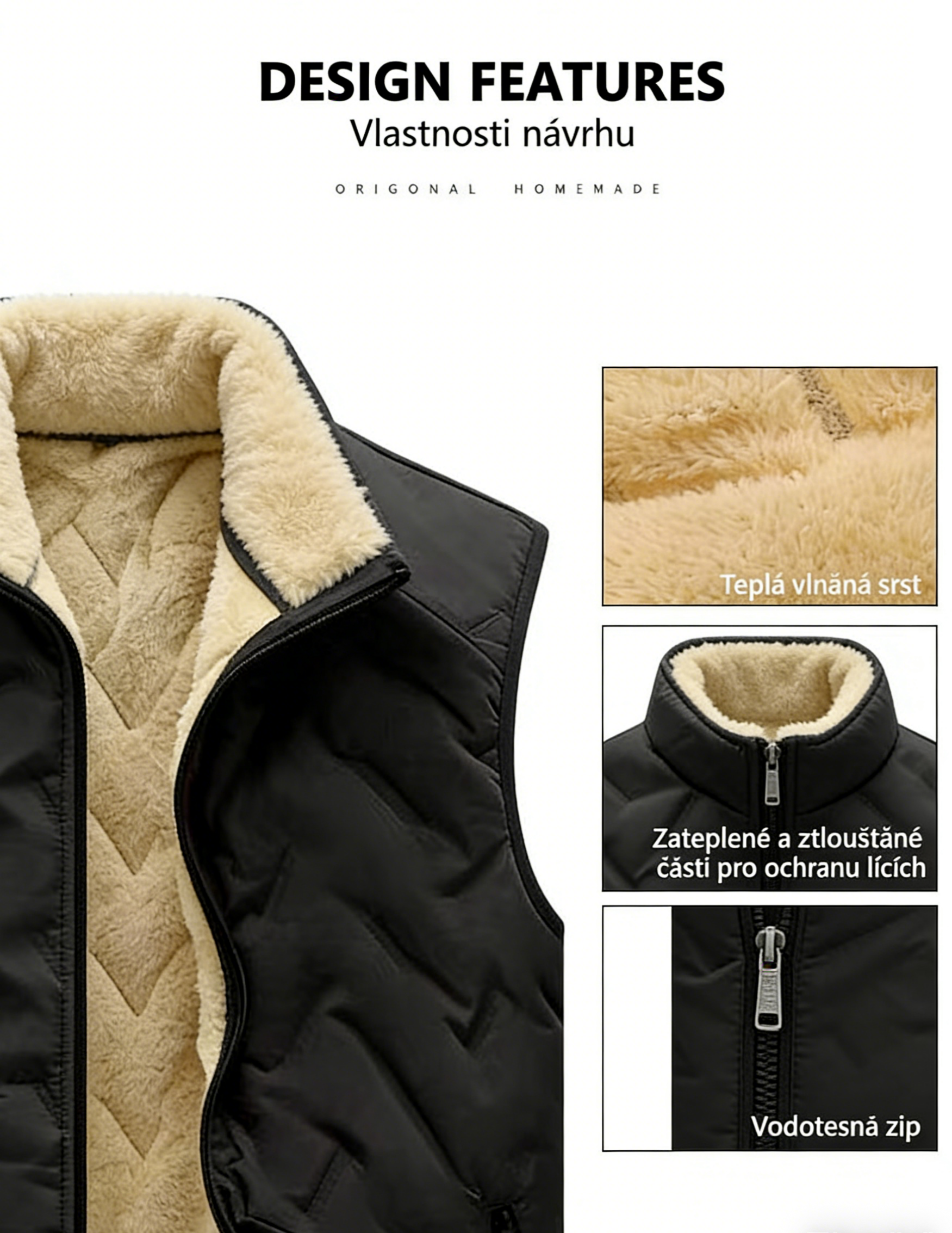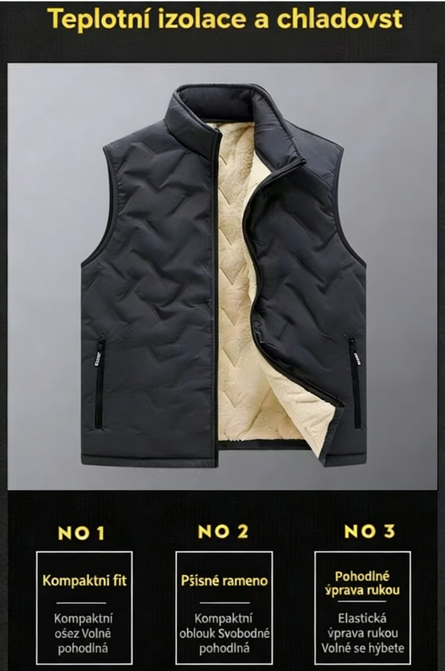 Trojrozměrný a Přiléhavý Střih 👤: Vesta není jen teplá, ale i stylová. Elegantně kopíruje linie těla bez omezování pohybu.